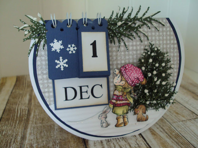 Christmas card making is in full swing here at the DOL house....I made this Christmas card advent calendar using another sweet Dreamerland Crafts stamp....She is so sweet. I coloured her up with prismas. I made the spruce tree using the Martha Steward pine branch punch....and added liquid applique to make the snow on the tree.